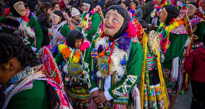 Mujeres disfrazadas durante el la Fiesta de la Virgen del Carmen de Paucartambo. Crédito: Shutterstock.