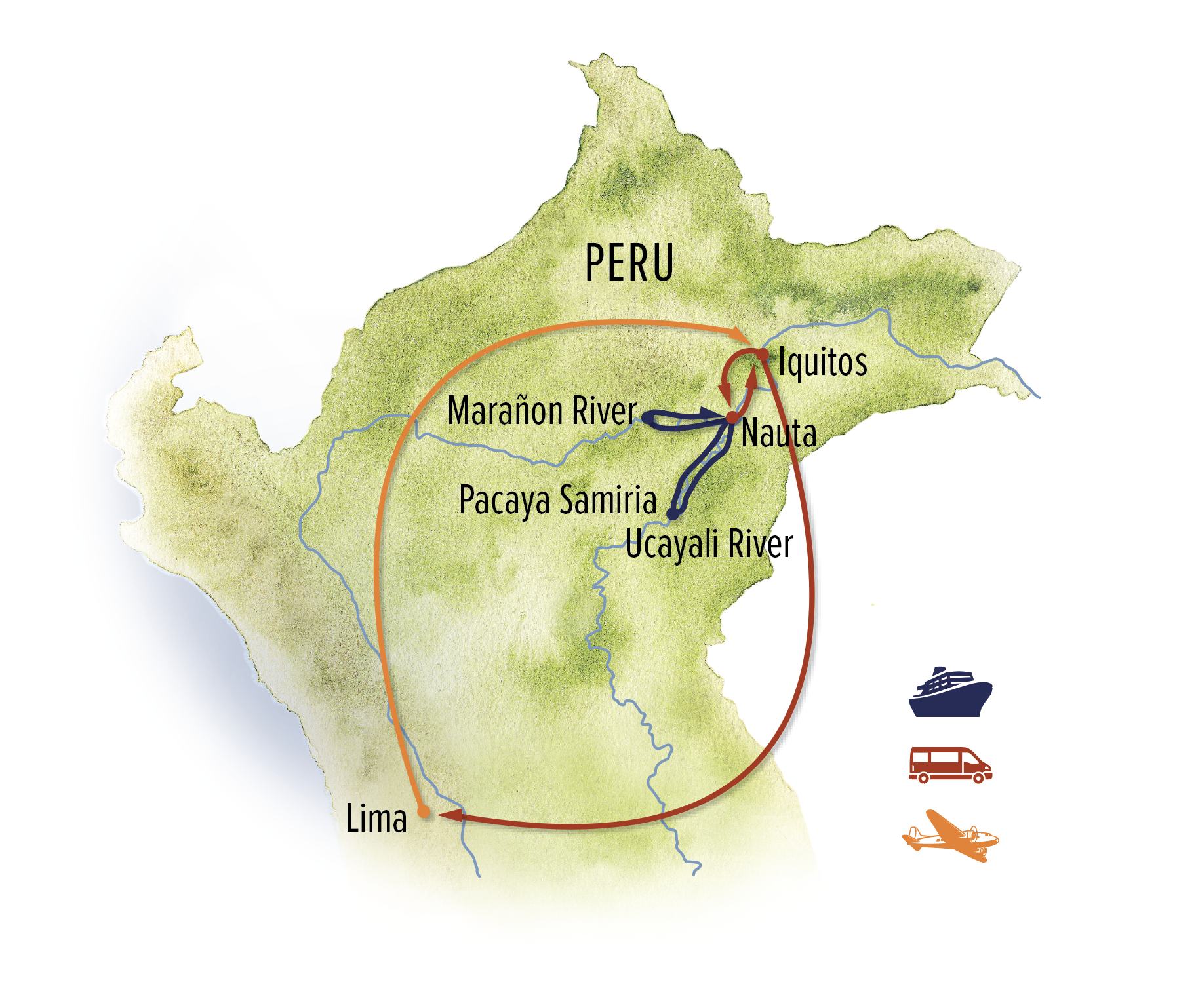 A 9-day exploration of rainforest wildlife along over 400 miles of Peruvian Amazon aboard a deluxe riverboat.