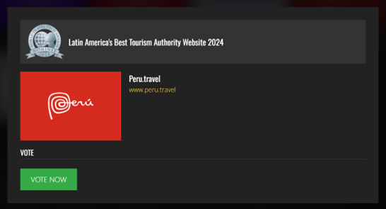 Una volta registrato, entra alla categoria Latin America's Best Tourism Authority Website, e fai click su Peru.travel per votare per il Perù.