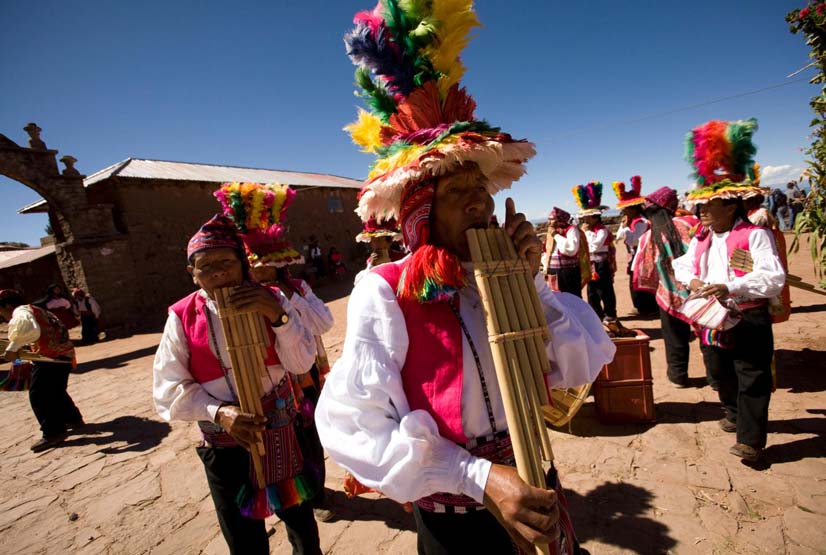 Músicos sikuri na Ilha Taquile, Puno. Crédito: Gihan Tubbeh / PromPerú.